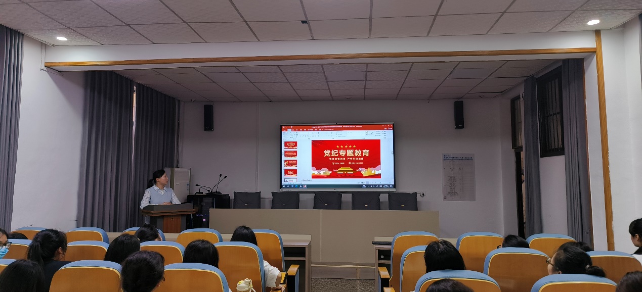 本科生第二党支部书记易临群给大家带来了“筑牢思想防线 严守纪律底线”的党纪学习教育专题党课,她分别从三个方面进行讲授:一是在思想境界上,要强化四种意识,即必须增强党的意识、群众意识、责任意识和自律意识;二是在道德修养上,要做到“五慎”,即要慎初、慎独、慎友、慎言和慎好;三是在实际行动上,要把好“三关”,即把好家庭廉政关、重点岗位关和廉政监督关。她最后提到四句话与在座党员同志们共勉:政治上跟党走、经济上莫伸手、作风上解民忧和工作上争上游。