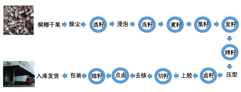 (1)选籽:槟榔干果进入工厂后,在实际生产时按照工厂生产要求对槟榔干果进行挑选和分级。将究头籽、扁头籽、纹路粗细不同的籽、籽型条度不同的籽、光头以及半光头籽、大小不同的籽粒等分开,并挑出烂籽、霉籽。该工序直接影响槟榔成品的质量。