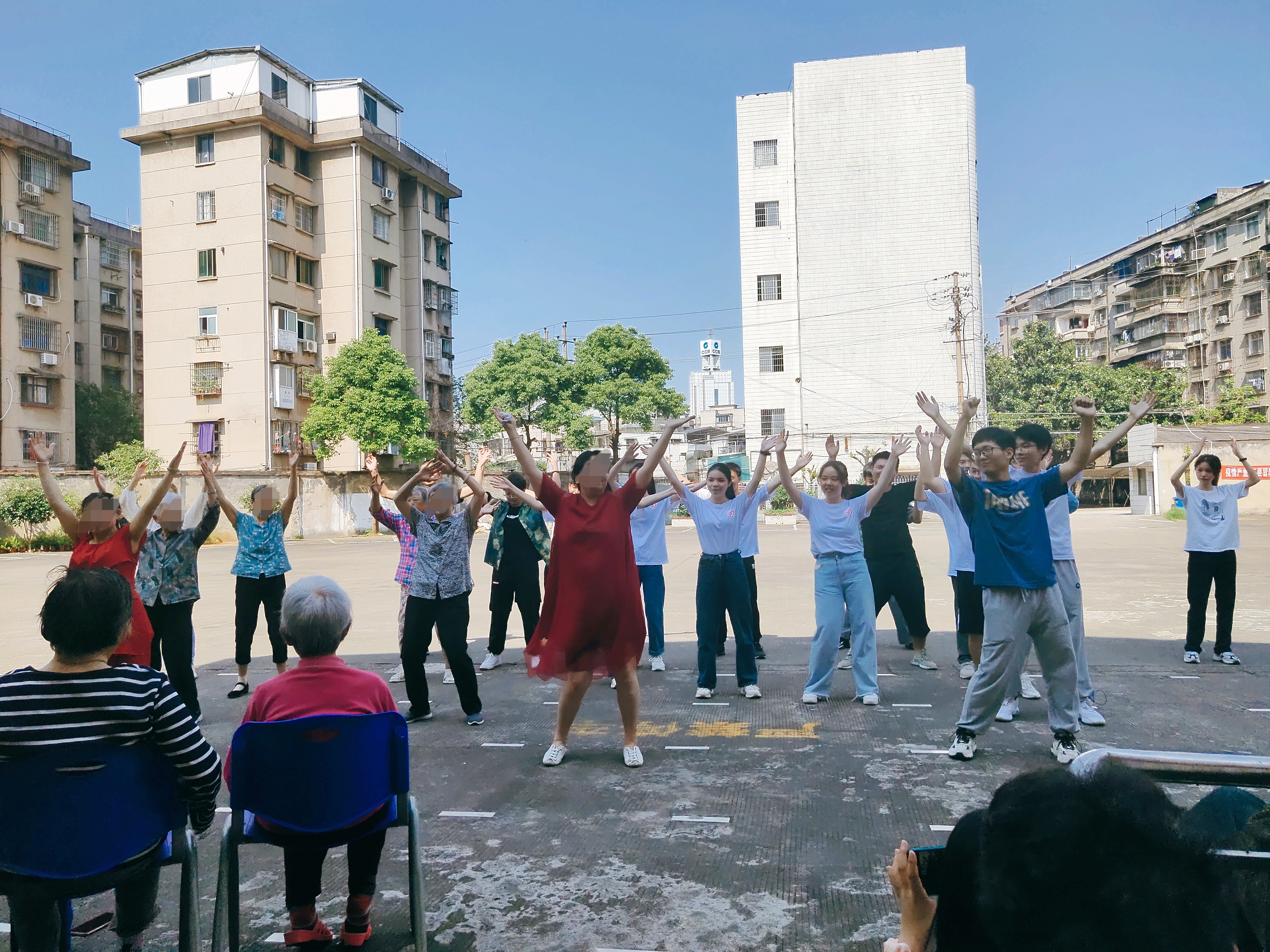 紧接着,我们给爷爷奶奶表演了节目,生命科学学院的志愿团给爷爷奶奶带来广场舞《最炫民族风》、合唱《倔强》,机电工程学院志愿团给爷爷奶奶带来《三句半》以及大家合作完成的合唱《明天会更好》《没有共产党就没有新中国》,并且我们还与爷爷奶奶一起跳起了广场舞,我们突然意识到,她们也不过是比我们大几十岁的小朋友呀,此时此刻,我们的心是在一起的,我们欢歌,我们起舞。