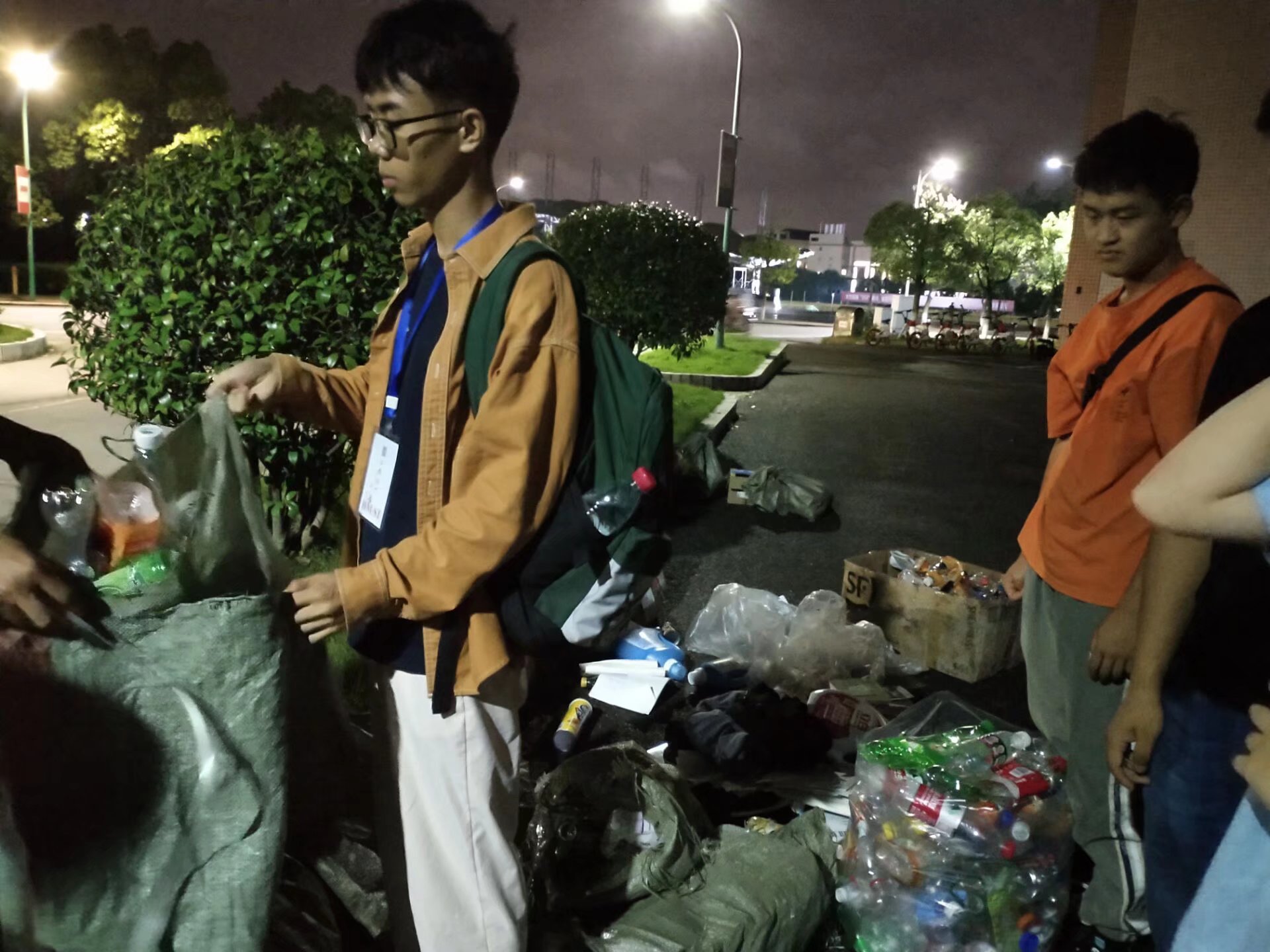 晚上七点半,志愿者们早早的在美术楼前集合,分好小组。绿色回收活动在五区、六区、七区和八区的部分寝室进行开展,合影留念后,志愿者们在负责人的带领下按照各分配的区域开始了浩浩荡荡的下寝回收之旅。