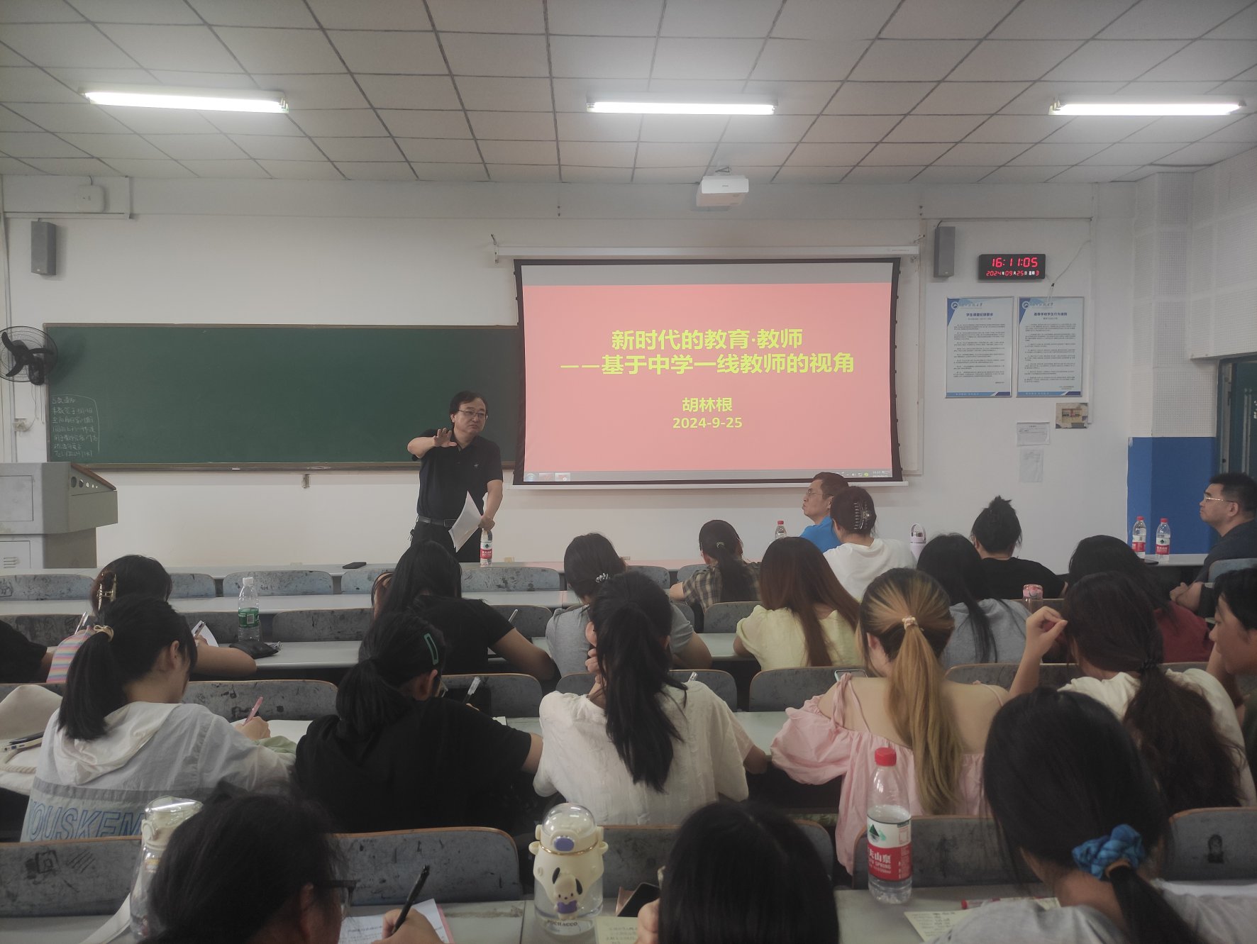 9月25日下午,湘乡二中党委书记、校长胡林根,副校长张云海等一行莅临我校讲学。胡林根书记带来了题为“新时代的教育·教师——基于中学一线教师的视角”的精彩讲座。讲座由yl23411永利集团官网副院长刘长军主持,全院师生代表共200余人到场聆听。