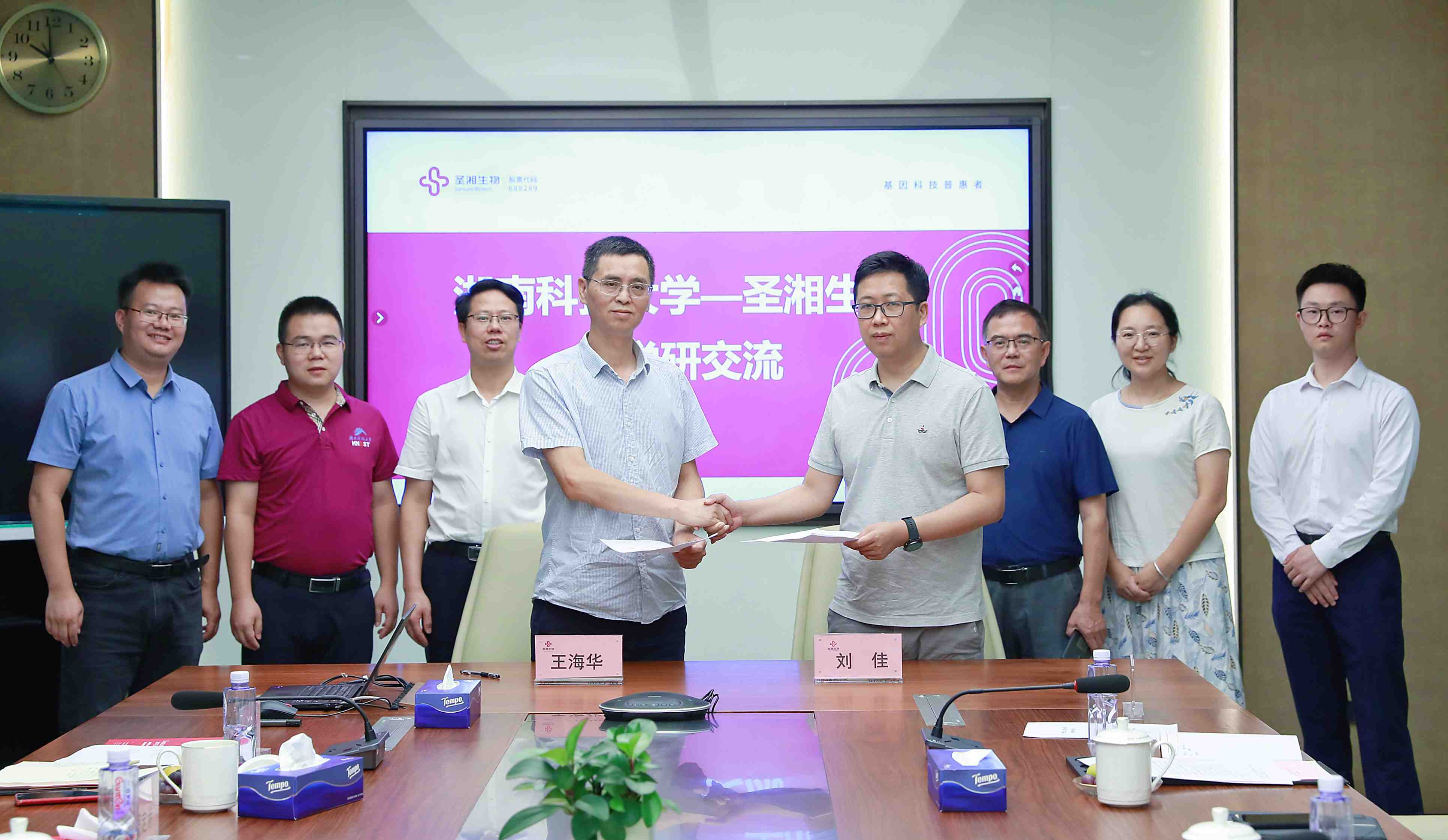 第一站是企业代表——圣湘生物科技股份有限公司。公司副总经理邓中平在一楼展厅亲自介绍公司理念、发展历程、核心产品和未来愿景,随后到圣湘生物国际会议中心开展产学研合作研讨会座谈,双方签订了《产学研及人才联合培养战略合作协议书》,充分发挥各自优势,共同构建产学研联盟的创新体系,努力实现“校企合作、产学共赢”。