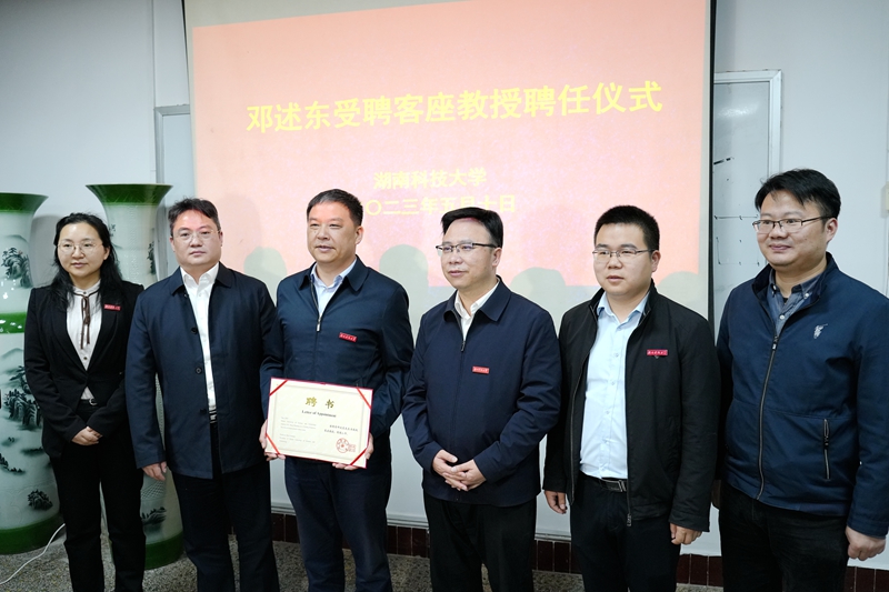 聘任仪式在yl23411永利集团官网生物楼105会议室举行,由湖南科技大学校纪委书记郭时印为邓述东颁发聘书,佩戴校徽,真诚欢迎他的加入。期待双方能在重大课题研究、农业和粮食生产、科技创新等多个领域开展合作,努力促进学校的师资队伍建设,大力提升学生的创新精神和实践能力,推动学校的高质量发展。
