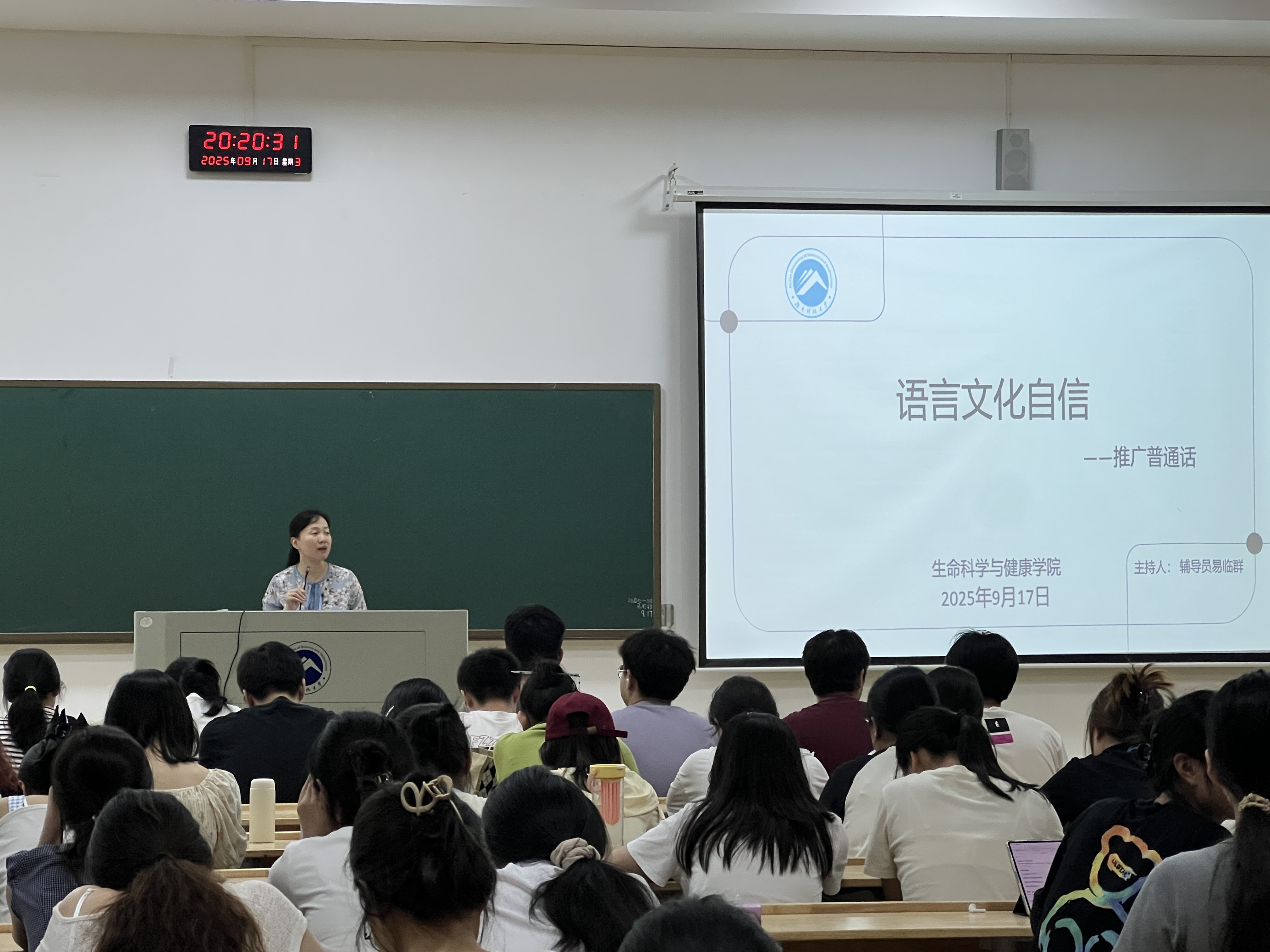 9月17日20:00,学院普通话动员大会顺利召开,院党委副书记舒艳出席,由易临群老师主持,学院辅导员、学生干部及学生代表参会。大会以“语言文化自信”为核心切入点,深刻阐释普通话不仅是沟通工具,更是文化传承与自信表达的载体。大会强调,规范使用普通话是专业学习的“基本功”与学术交流的“通用语”,直接关系到知识传递的精准度与文化观点的影响力。会上明确“专业术语规范读”“实验操作规范说”等要求,发布《学院普通话推广实施方案》,并提出将普通话使用纳入班级学风考核,进一步凝聚师生推普共识。